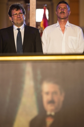A függöny felgördülése előtt Észak- és Dél-Komárom polgármester is szólt a nézőkhöz. Dr. Molnár Attila Dél-Komárom vezetője elmondta, hogy az, amiről nem tudunk, nem része a nemzeti tudatnak, nem épít bennünket. Sajnos Alapy Gáspárról is keveset tudunk, noha ő volt az a polgármester, aki 7 utcás kis településből egy 53 utcás virágzó kisvárost hozott létre, miközben a lakosság száma megháromszorozódott. Stubendek László Észak-Komárom polgármestere mindehhez hozzátette, hogy a felvidéki magyarságnak is van egy olyan politikusa, név szerint gróf Esterházy János, aki egyedüliként emelte fel szavát a szlovák parlamentben a zsidóüldözések ellen. Évtizedekig Eszterházyról sem volt szabad beszélni. Az észak-komáromi polgármester külön örömét fejezte ki azért, hogy azt a széket, amiben egykor Alapy Gáspár ült a bemutató erejéig kölcsönadhatta, így teremtve meg egy szellemi és lelki kapcsolódást múlt és jelen között.