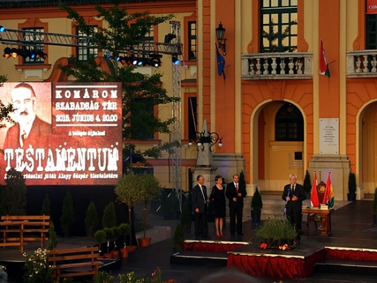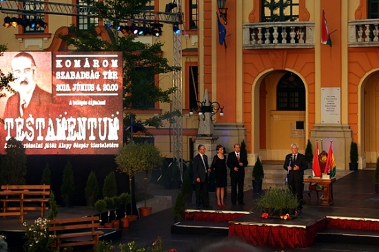Június 4-én, a trianoni békediktátum aláírásának 95. évfordulóján, a nemzeti összetartozás napján mutatták be a Szabadság téren Koltay Gábor rendezésében a Testamentum című darabot. A zenés pódiumjátékon egykori polgármesterünk Alapy Gáspár életútját követhettük nyomon az 1920-as évektől 1944-ig. A premieren megjelent Észak- és Dél-Komárom vezetése, illetve Alapy Gáspár unokája és családja is.