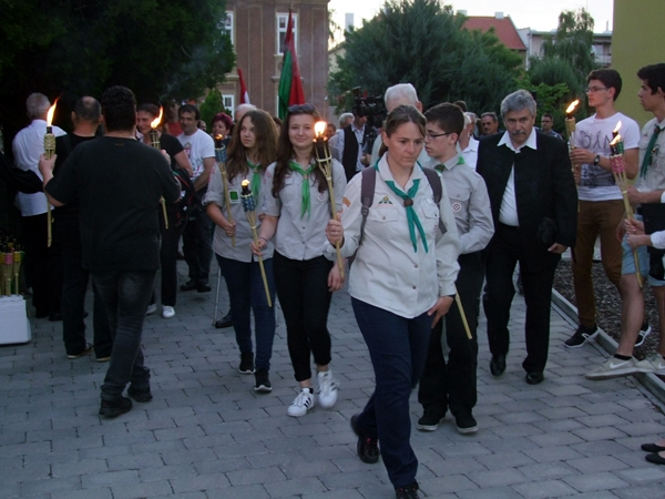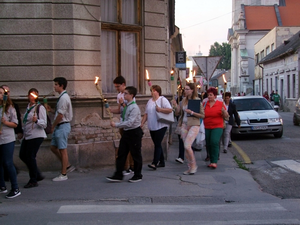 Az északi és a déli városrész közös megemlékezését a dél-komáromi Endresz Csoport és az észak-komáromi Egy Jobb Komáromért Polgári Társulás szervezte. A múltidézés istentisztelettel kezdődött az észak-komáromi református templomban, ahol Nagy Zsolt lelkipásztor prédikációjában elhangzott: Komárom saját testében élte meg a kettészakítottság megaláztatását és fájdalmát, hiszen a trianoni diktátum a nagy múlttal rendelkező városból két fél várost csinált. Az istentisztelet után az emlékezők a református parókia udvarán álló Trianon emlékűmhöz vonultak, amit 2010-ben a Te Ügyed Kör (T.Ü.K.Ö.R) állíttatott. Talapzatánál hat év alatt sok település nevével megjelölt követ helyeztek már el, utalva Wass Albert Üzenet haza című versének elhíresült sorára, miszerint „…a víz szalad, a kő marad, a kő marad!" Most újabb kövek kerültek ide tanúbizonyságul. A Szózat elhangzása és a Himnusz eléneklése után a tömeg 96 fáklyavivő vezetésével méltóságteljes csöndben átvonult a trianoni határon a dél-komáromi Turul- emlékűmhöz.