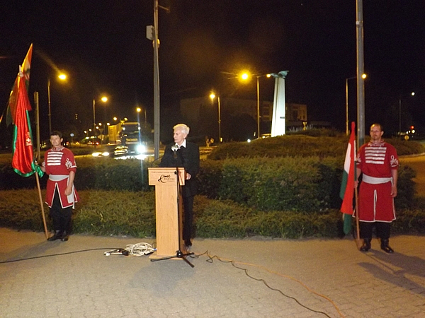 Szmrecsányi Boldizsár szobrászművész alkotásánál ezúttal Koltay Gábor érdemes művész, Magyar Örökség-díjas filmrendező mondott beszédet, aki hangsúlyozta: Trianon lassan száz éve vet fel kérdéseket. Sokan beszélnek a határok feletti nemzetegyesítésről, amit azonban nagyon nehéz valódi tartalommal megtölteni. Komárom azonban az elmúlt években rengeteget tett azért, hogy a határok megváltoztatása nélkül csökkentse a kettészakítottság érzését, újraegyesítse az északi és a déli városrészben élőket. A nemzeti összetartozás jegyében szervezett rendezvényen Boráros Imre Kossuth-díjas színművész mondta el Gágyor József Vallomás és Magyar Aliz Történelmi lecke Európának című versét, majd a megemlékezés a Himnusz eléneklésével és a Turul-emlékmű megkoszorúzásával ért véget.