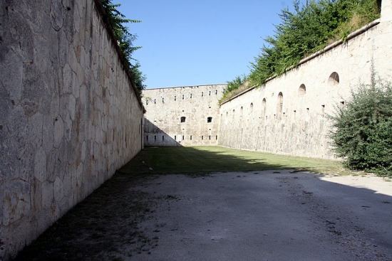 Az erőd belsejébe érve, jobb kéz felől, a keleti szárnyon az istállókat, északi részén a földszinti legénységi épületet (ezt úgy építették, hogy szükség esetén 300 ágyas kórházzá lehessen átalakítani), az udvarba benyúlva az emeletes, alápincézett tiszti épületet pillanthatjuk meg; bal kéz felől pedig az egykori kantin, s a pékség helyezkedik el. A tiszti épület kivételével a helyiségek külső oldalai védőfolyosókhoz csatlakoznak, melyek vonalát, a sáncárokba beékelődve, nyugatról és délről egy-egy emeletes, azonos elrendezésű "bástya" (caponniere) töri meg. A külső kaputól a főbejáratig vezető utat oldalazó tűzzel az un. "Flankierungsthurm" fedezi. Ebben található az erőd legszebb helyisége, a boltíves pillérekkel tagolt levente oktatóterem.